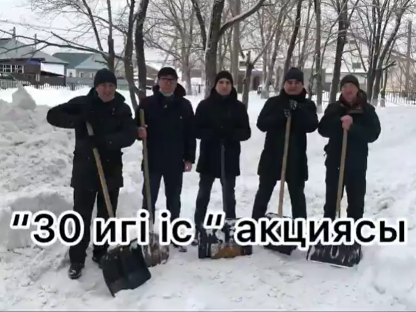 "30 игі іс" акциясы аясында мектеп мұғалімдері мен техникалық қызметкерлері мектеп аумағында қар тазалау челленджіне қатысты.
