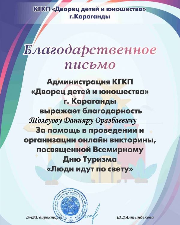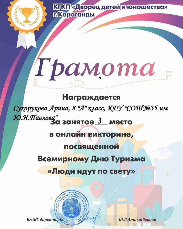 24 сентября 2020 прошла онлайн-викторина, посвящённая всемирному Дню Туризма "Люди идут по свету". В ней приняли участие учащиеся 7 "А" и 8 "А" классов Жас сарбаз.