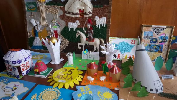 Қазақстан Республикасы Тәуелсіздігінің 25 жылдығын мерекелеу барысында мектепте 1-11 сыныптар арасында "Менің Тәуелсіз Қазақстаным" тақырыбында суреттер мен қолдан жас…