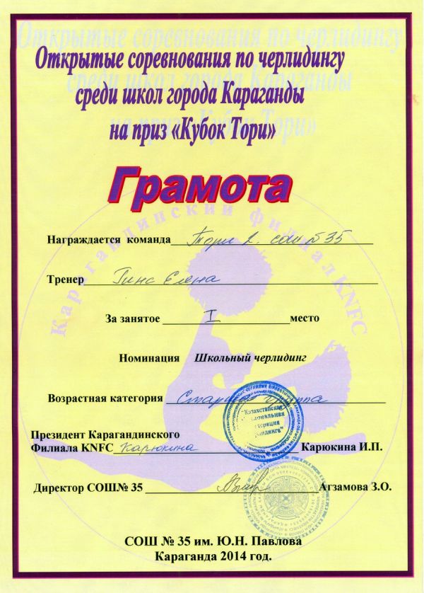На базе нашей школы в преддверии праздника «Наурыз» 15 марта 2014 года состоялся открытый городской турнир по дисциплине «Черлидинг» среди шко…