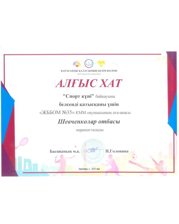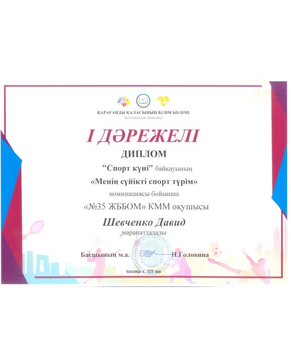 "Спорт күні" қалалық байкауының "Менің сүйікті спорт түрім" номинациясы бойынша 1-ші дәрежелі димпломмен 6 "В" сынып оқушысы Шевченко Давид марапатталды. Сондай-ақ, Дав…