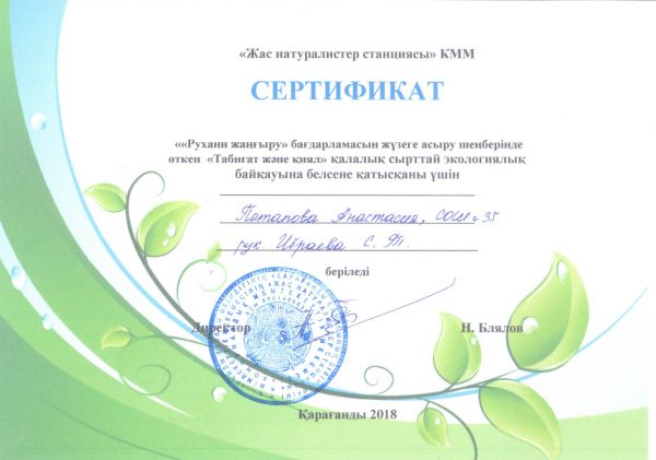 "Рухани жаңғыру" бағдарламасын жүзеге асыру шеңберінде өткен "Табиғат және қиял" қалалық сырттай экологиялық байқауына белсене қатысқаны үшін…