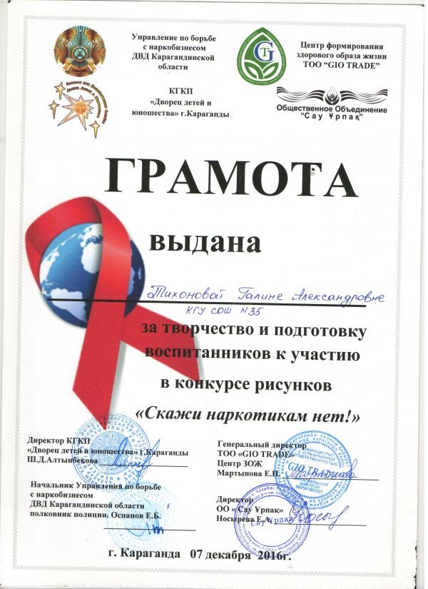 Администрация школы благодарит учителя ИЗО Тихонову Г.А. за творчество и подготовку воспитанников к участию в конкурсе рисунков "Скажи наркотикам нет!"