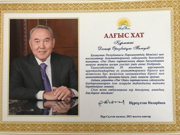 28 января 2021 года заместитель директора по воспитательной работе КГУ «ОШ имени Ю.Н.Павлова» Толеуов Данияр Оразбаевич был награжден благодарственным письмом Председателя партии Н.А.Наз…