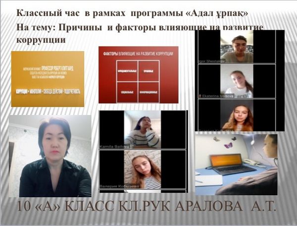 27 января в 10"А" классе прошел онлайн классный час в рамках программы " Адал ұрпақ" на тему : Причины и факторы влияющие на развитие коррупции. На платформе "Zoom" был…
