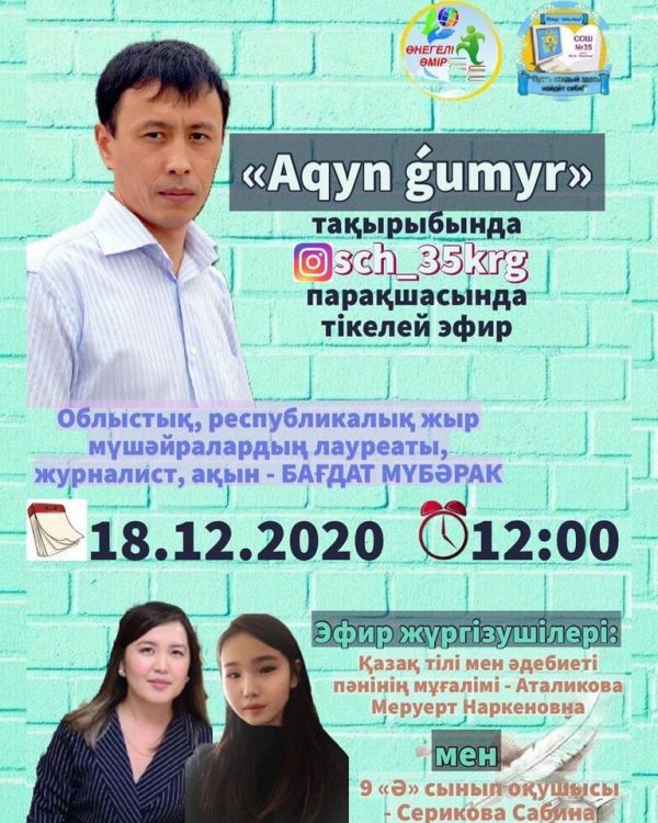 «Өнегелі өмір» жобасы аясында 18-желтоқсанда ақын, облыстық, республикалық мүшәйралардың лауреаты, журналист - Бағдат Мүбәракпен онлайн кездесу өтеді.