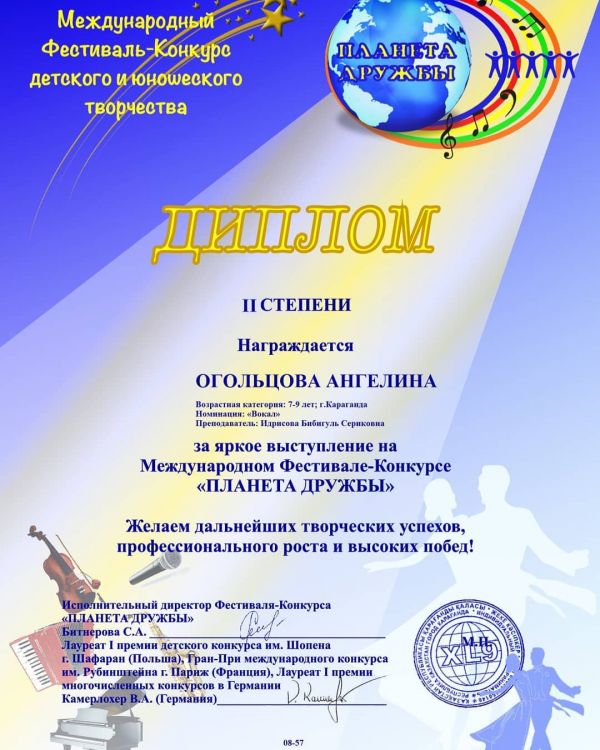Поздравляем учащихся 3 "Ә" класса Нұрымхан Бексұлтан, Нұрымхан Айқын и ученицу 3 "В" класса Огольцову Ангелина за занятое 2 место в Международном фестиваль – конкурсе детск…