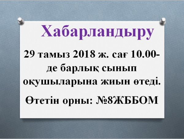 29 тамыз 2018 ж. сағ 10.00- де барлық сынып оқушыларына жиын өтеді.