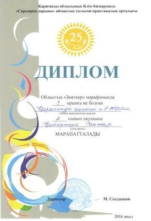 "Жасыл ел" халықаралық форумы шеңберінде өткен аймақтық сырттай экологиялық байқауда жеңіске жеткен 2 сынып оқушысы Гуренко Александра ІІ- дәрежелі Дипломмен марапатталды.