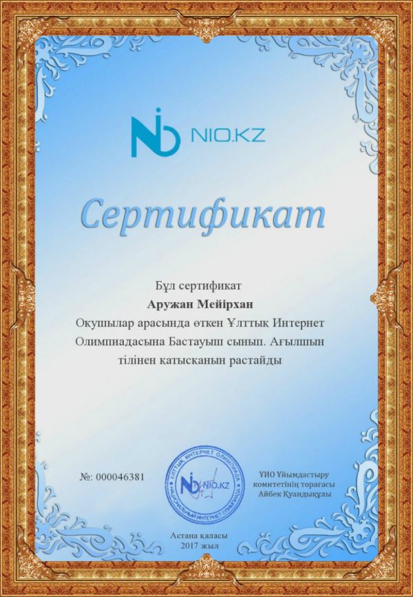 Бастауыш сынып. Қазақ тілінен өткен Ұлттық Интернет Олимпиадасының жеңімпазы Қарағанды облысы, Қарағанды қаласы, 8 ЖББОМ оқушылары Аружан Мейірхан, Сабина Төкенова І дәрежелі дипломмен марапатталды.…