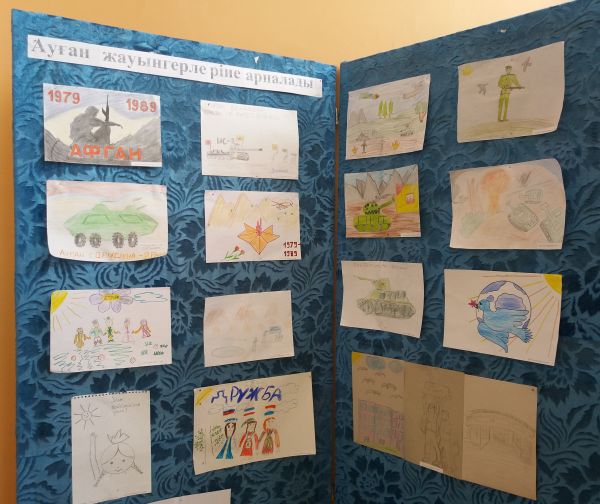 В школе на І этаже была организована выставка рисунков «Ауған жауынгерлеріне арналады» и оформлен стенд «Ерлікке тағзым етеміз».