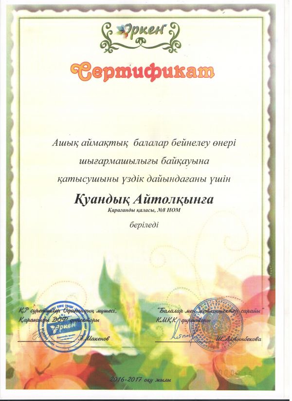 Ашық аймақтық балалар бейнелеу өнері шығармашылығы байқауының "Сәндік-қолданбалы өнер" "Менің таңғажайып әлемім" номинациясы бойынша ІІІ орынға ие болған 6 А сынып оқушысы Наурыз…