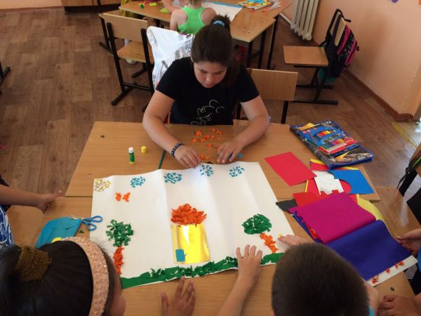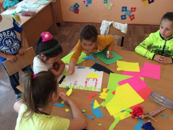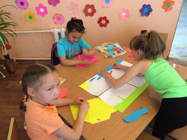 Ребята из всех отряд поделились на группы и делали аппликации из цветных бумаг на тему: "Лето".