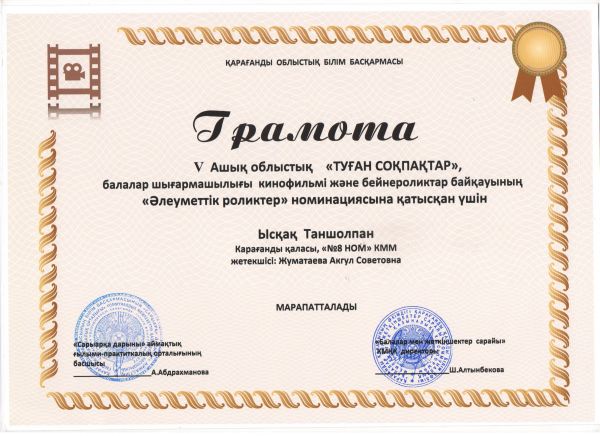 V ашық облыстық "Туған соқпақтар" балалар шығармашылығы кинофильмі және бейнероликтар байқауының "Әлеуметтік роликтер" номинациясына қатысқаны үшін Ысқақ Таншолпан және Сапархано…