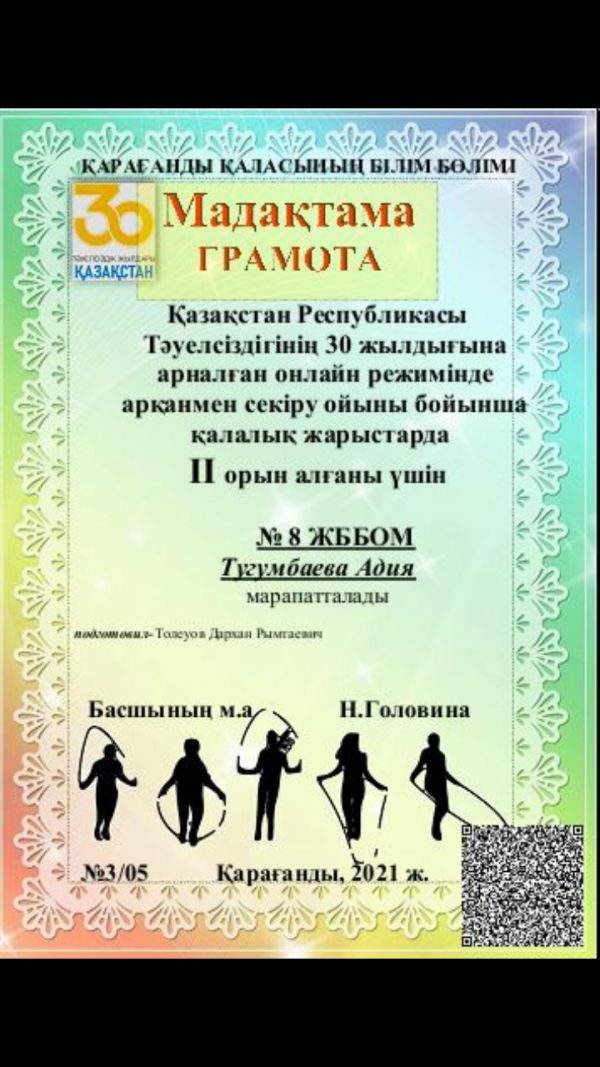 ҚР Тәуелсіздігінің 30 жылдығына арналған онлайн режимінде арқанмен секіру ойыны бойынша қалалық жарыстарда: