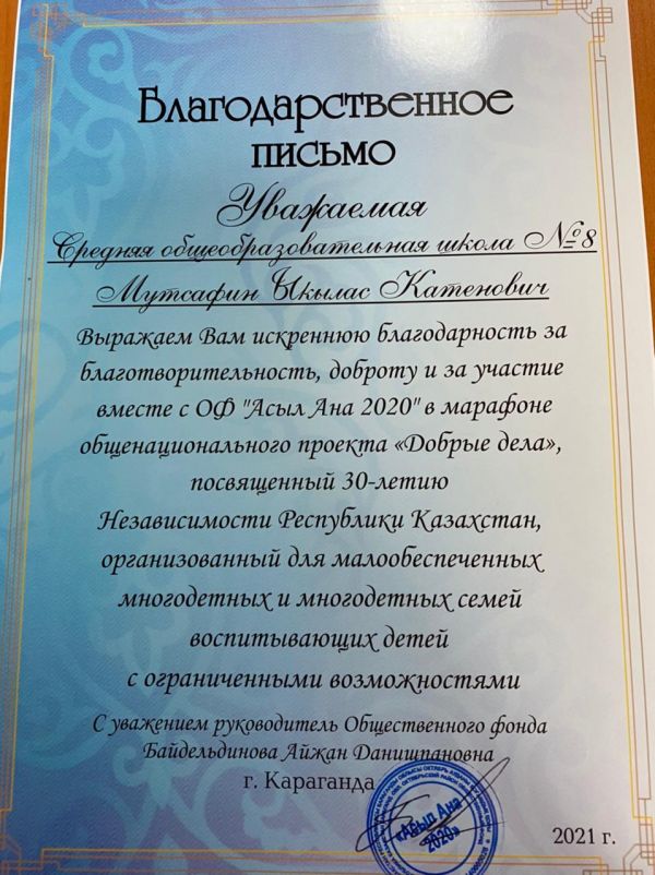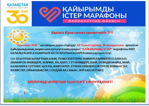 ҚР Тәуелсіздігінің 30 жылдығына арналған «30 игі іс» шарасы аясында «Асыл Ана 2020» қоғамдық қорымен бірлесе отырып өткізілген қайырымдылық акциясы…