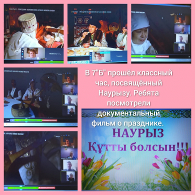 Сегодня в 7 "Б" прошёл классный час, посвящённый Наурызу. Ученики посмотрели документальный фильм о праздновании Наурыза в стране, назвали традиции, сохранившиеся до наших дней.