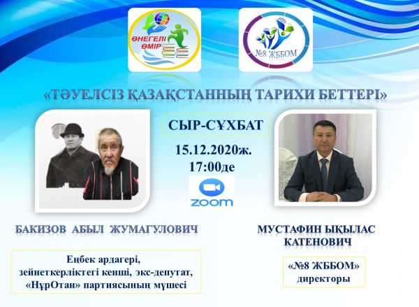 15.12.2020 жылы сағат 17:00де мектебімізде «Өнегелі өмір» жобасы аясында «Тәуелсіз Қазақстанның тарихи беттері» тақырыбында онлайн түрде сыр-сұхбат өткізіледі. Сұхбатымыздың…