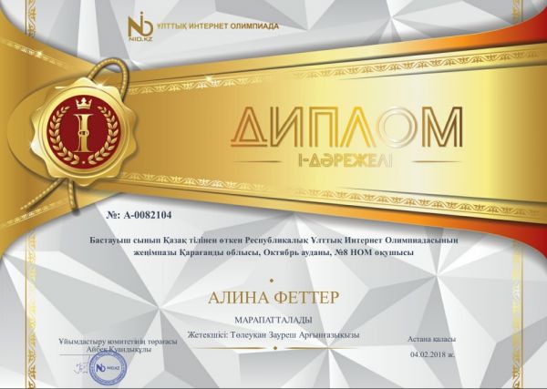 Бастауыш сынып оқушымыз Алина Феттер Қазақ тілінен өткен Республикалық Ұлттық Интернет Олимпиадасының жеңімпазы атанып, 1 дәрежелі Дипломмен марапатталды