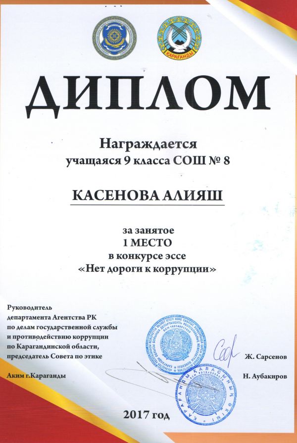 Қазақ тілі пәні бойынша мұғалімдерге арналған Республикалық қашықтық олипиадасының жеңімпазы Қарағанды облысы Қарағанды қ. №8 орта мектебінің мұғалімі Анар Кемешова марапатталады. ІІІ дәрежелі дипло…
