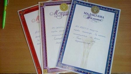 Дене тәрбиесі мұғалімдерінің арасында өткізілген Қазақстан Республикасы Тұңғыш Президенті- Елбасының Президенттік тесттен облыстық жарыста І орын алған үшін Калибеков Алданыш марапатталады