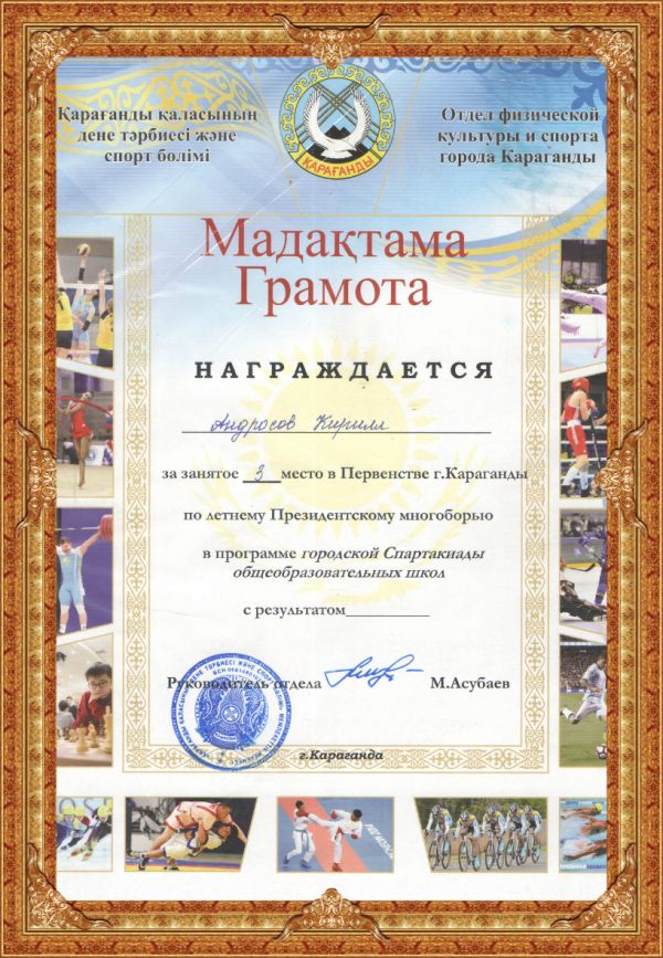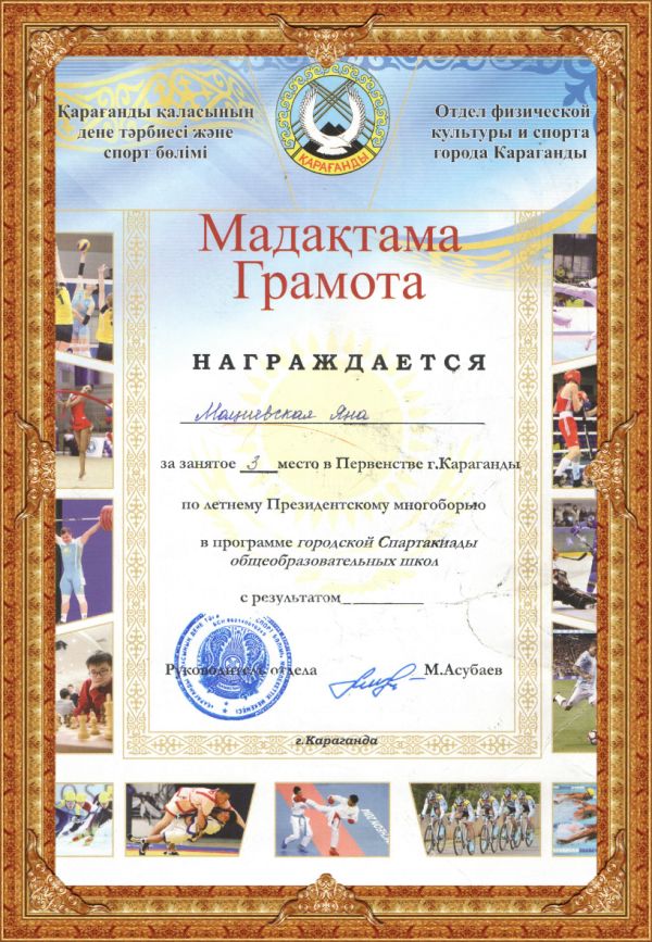 Диплом награждается Команда ОСШ №8 за занятое ІІІ место в Первенстве г. Караганды