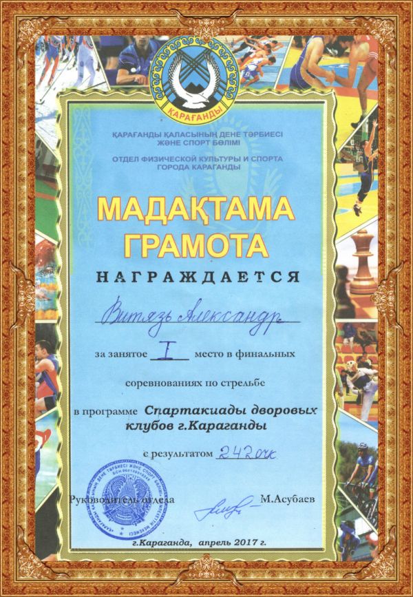 Награждается Зубкова Александра, Витязь Александр, Астафьева Ангелина, Марипова Алсу за занятое І место в финальных соревнованиях по стрельбе в программе Спартакиада деоровых клубов г. К…