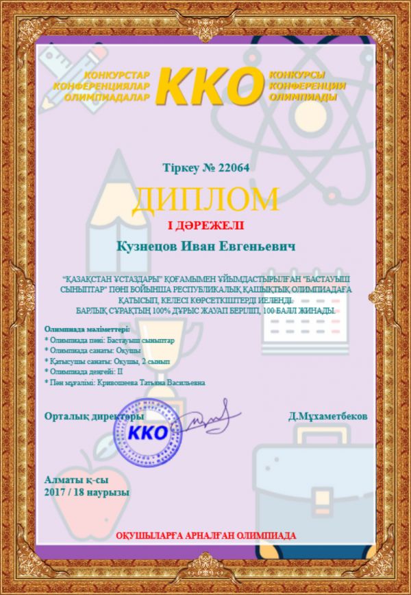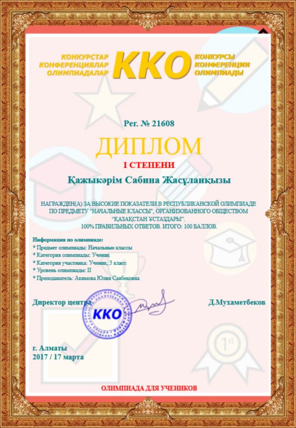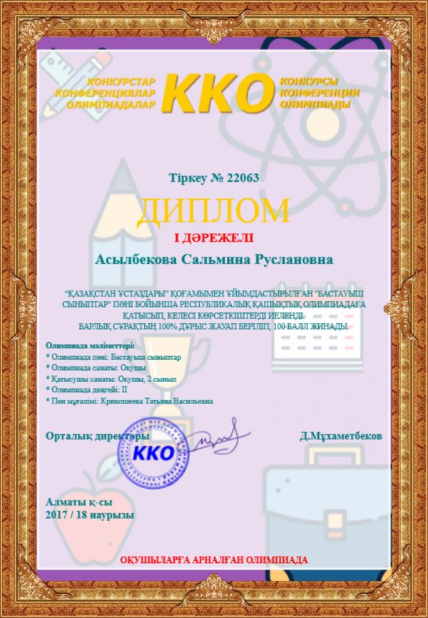 "Қазақстан Ұстаздары" қоғамымен ұйымдастырылған "Бастауыш сыныптар" пәні бойынша Республикалық қашықтық Олимпиадаға қатысып, келесі көрсеткіштерді иеленді.Барлық сұрақтың 100% &n…