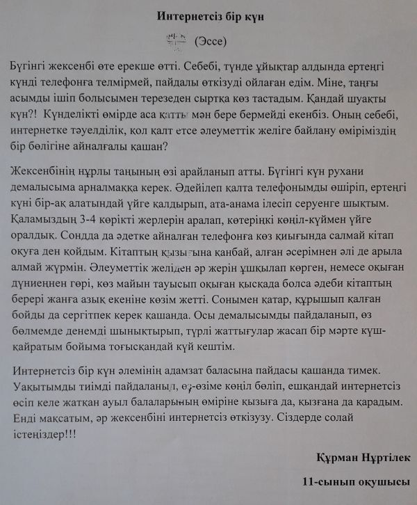Среди учащихся 1-11 классов была проведена акция «Я - офлайн». Из всех работ были отобраны самые лучшие работы учащихся. Основной целью акции является борьба с интернет зависимостью.