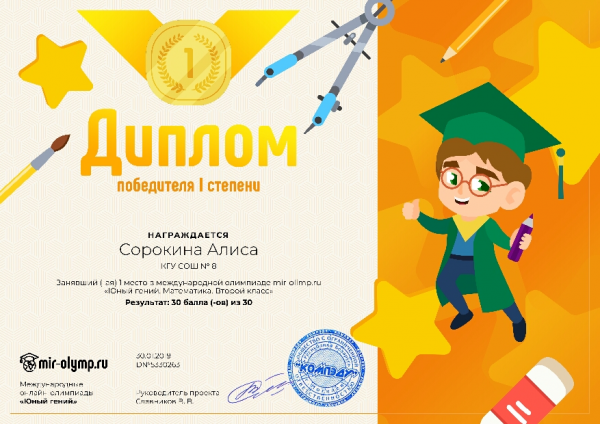 Ученики 2"Б" класса приняли участия в олимпиаде по математике. И показали отличный результат.