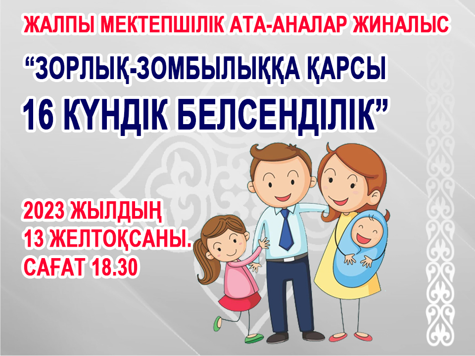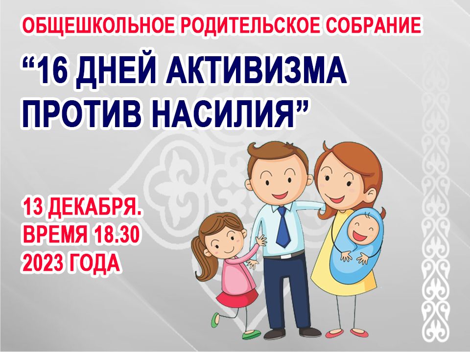 Жалпы мектепшілік ата-аналар жиналысының күн тәртібі. «Зорлық-зомбылыққа қарсы 16 күндік белсенділік» республикалық акциясы аясында зорлық-зомбылықтың алдын алу бойынша мектеп пен отбасының өзара іс-қимылы»