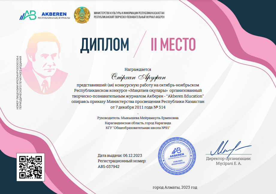 Творческо-познавательный журнал Акберен - “Akberen Education” организовал Республиканский конкурс "Мақатаев оқулары". В данном конкурсе ученица 8А класса Өмірхан Аружан заняла…