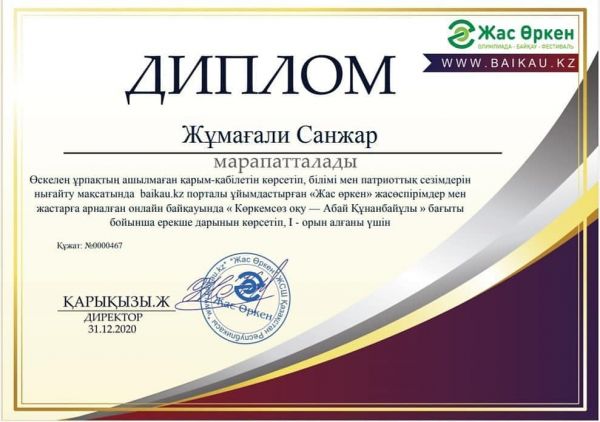3 "А" сынып оқушылары "Жас өркен" онлайн байқауына қатысып, I, II орындарга ие болды. Жақсы көрсеткіш көрсеткендері үшін құттықтаймыз!