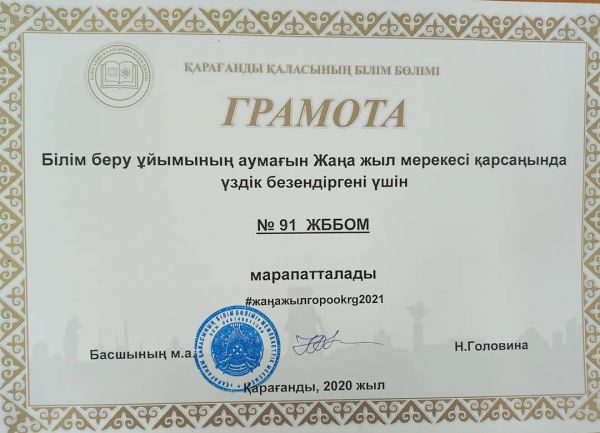Білім беру ұйымының аумағын Жаңа жыл мерекесі қарсаңында үздік безендіргені үшін №91 "ЖББОМ" марапатталды.