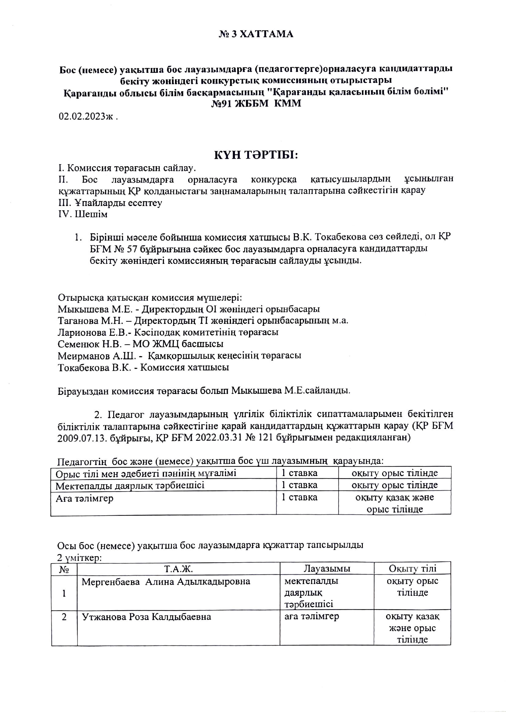Бос жұмыс орындары: Орыс тілі мен әдебиеті пәні мұғалімі, мектепалды даярлық тобы мұғалімі, аға тәлімгер.