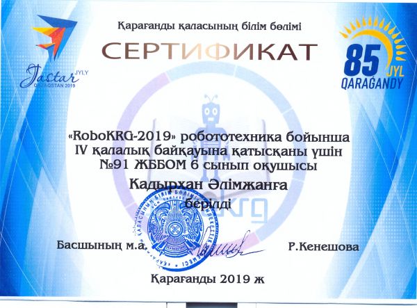 Қарағанды қаласыңың білім бөлімі ұйымдастыруымен өткен "RoboKRG-2019" қалалық робототехника байқауында №91ЖББОМ "Роботекс" командасы "Механикалық сумо" номинациясы бойы…