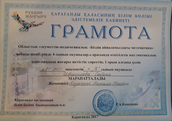 Гордость начальной школы! Ибрагимова Сабина, ученица 4 «Б» класса учителя Казаченко Н. Ю., заняла 1 место в Городской математической олимпиаде.