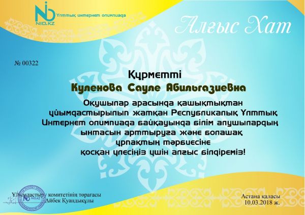Оқушылар арасында қашықтықтан ұйымдастырылған Республикалық Ұлттық Интернет олимпиада байқауына оқушыларды дайындағаны үшін Куленова Сауле Абильгазиевна ж?не Торгай Серикжан алғыс хатпен марапатталды
