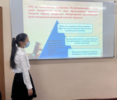 7а сыныбында “Діни қызмет және діни бірлестіктер туралы” ҚР Заңы тақырыбында сынып сағаты өткізілді.