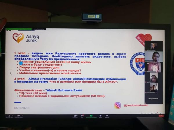 11 ноября состоялась онлайн встреча учащихся 10-11 классов с Мейрмановым Жандосом по теме: "Способы поступления в университет на грант"