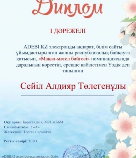 Оқушыларды сөз өнеріне баулу, шығармашылық тұрғыдан дамыту аясында ұйымдастырылған байқаудағы жетістіктерімен құттықтаймыз. Сынып жетекшісі: Торгай Серикжан.