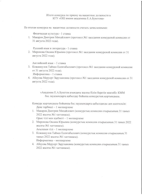 «Академик Е.А.Бөкетов атындағы ЖББМ» КММ бос лауазымдарға қабылдау конкурсының қорытындысы