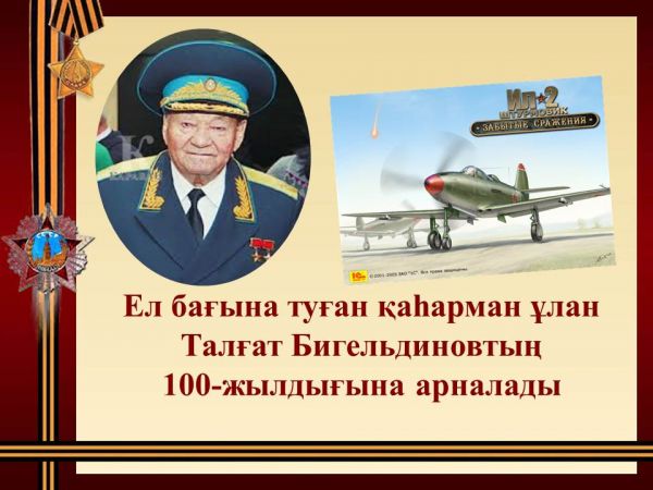 Екі мәрте Кеңес Одағының Батыры, ұшқыш-шабуылшы, Қазақстан авиациясының генерал-майоры Талғат Бигельдиновтың (1922-2014) 100 жылдығына арналады.