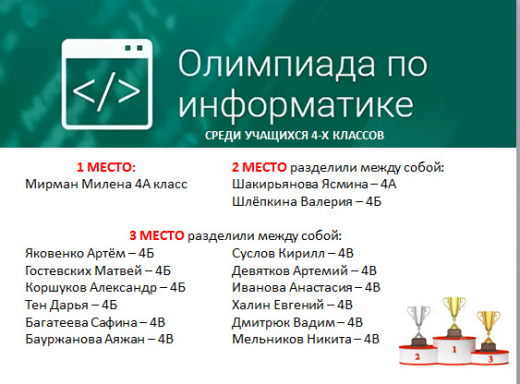 2 февраля в рамках недели информационной грамотности "Цифровой мир" среди учащихся 4-х классов прошла олимпиада по информатике. Поздравляем победителей!