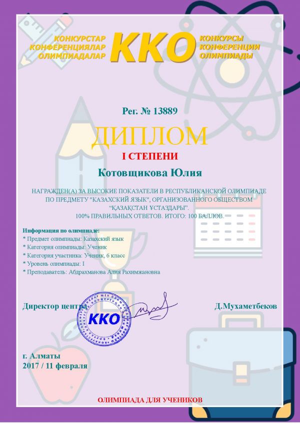 "Қазақ тілі" пәні бойынша Республикалық олимпиадада жоғары көрсеткіші үшін Котовщикова Юлия 1 дәрежелі дипломмен марапатталады.
