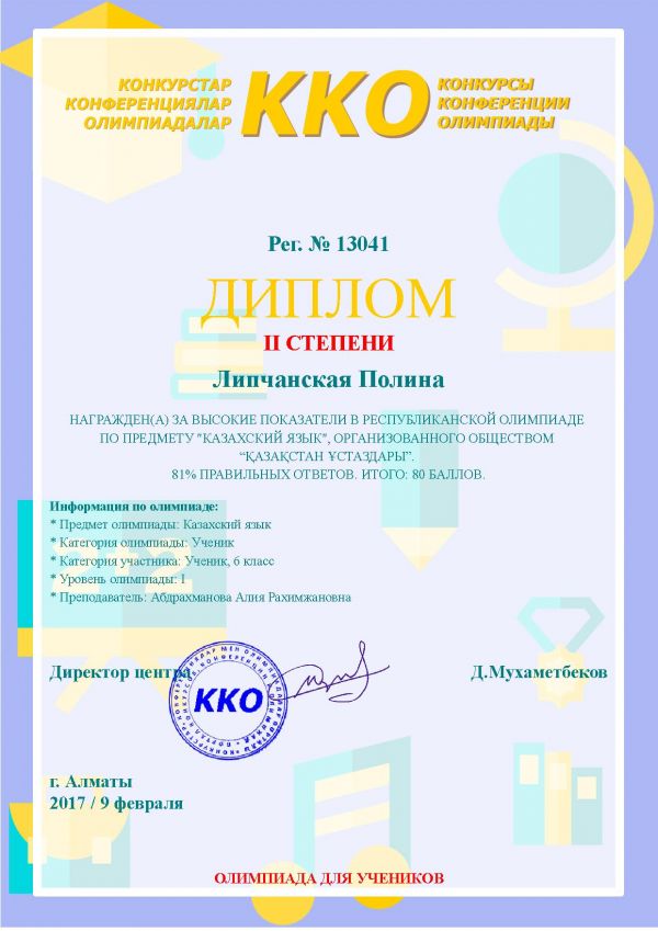 "Қазақ тілі" пәні бойынша Республикалық олимпиадада жоғары көрсеткіші үшін 2 дәрежелі Липчанская Полина марапатталады
