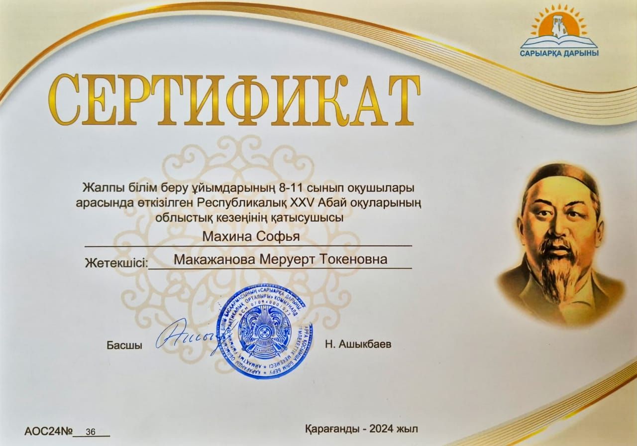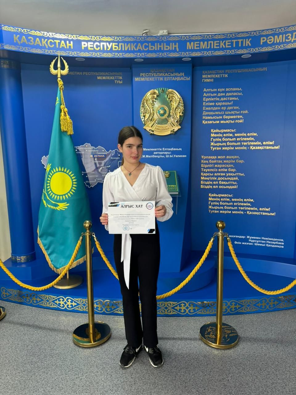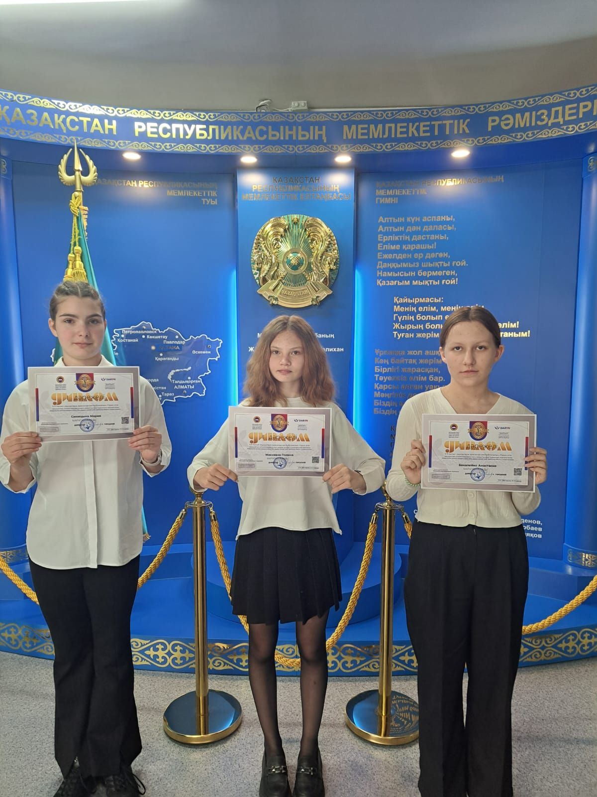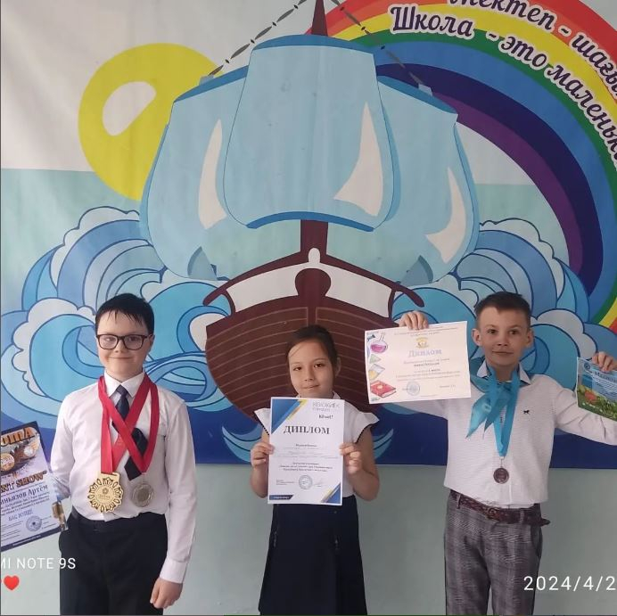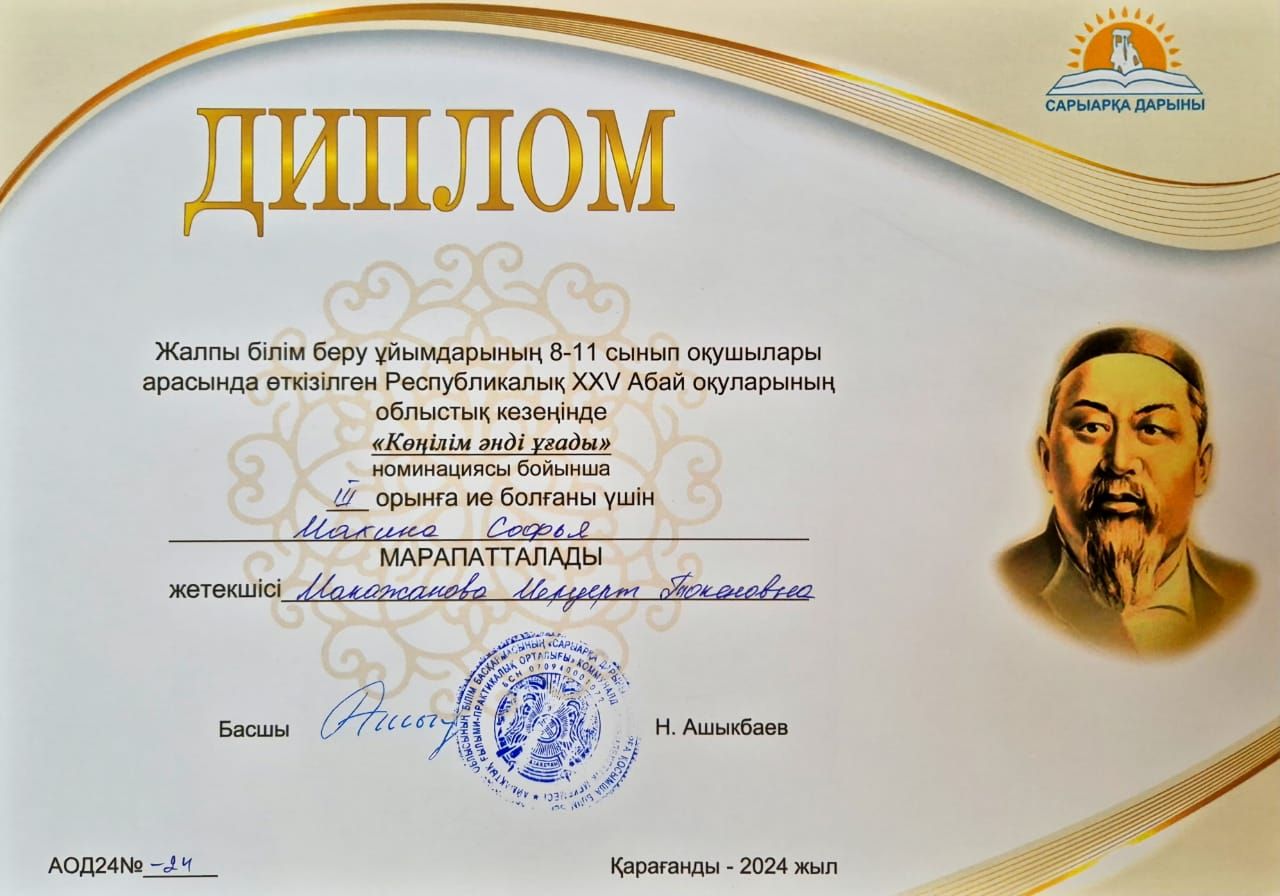 Мектебіміздің 8 сынып оқушысы Махина Софья Республикалық XXV Абай оқуларының облыстық кезеңінің «Көңілім әнді ұғады» номинациясы бойынша III дәрежелі Дипломмен марапатталды. Жетекшісі қа…