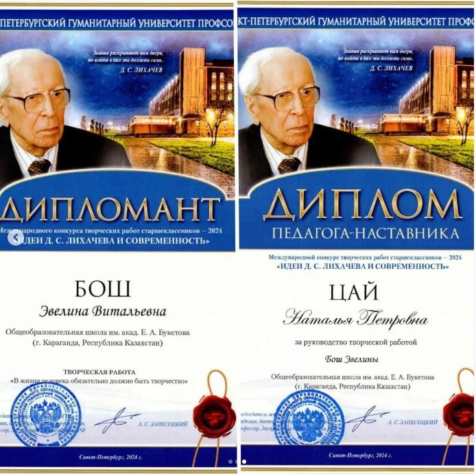 Бош Эвелина, ученица 11 "Б" класса стала дипломантом Международного конкурса творческих работ старшеклассников "Идеи Д.С. Лихачёва и современность" (г. Санкт-Петербург). Поздравл…