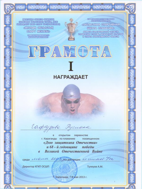 Гафуров Руслан награждаетя грамотой за занятое 1 место открытом первенстве г. Караганды по плаванию, посвященном "Дню защитника Отечества" и 68-й годовщине победы ВОВ