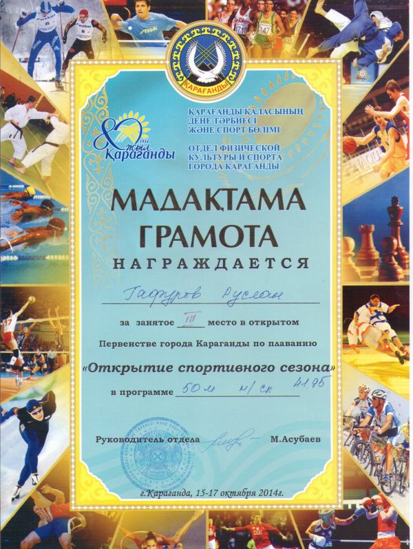 Гафуров Руслан награждается грамотой за занятое 2 место в открытом Первенстве города Караганды по плаванию, посвященному Открытию спортивного сезона